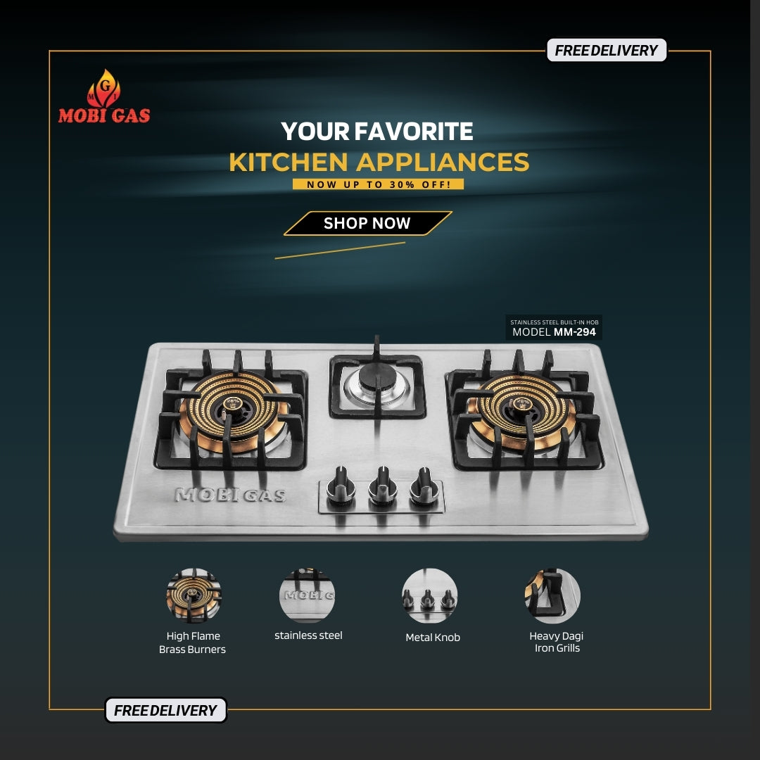 Upgrade your kitchen with the MOBI GAS MM-294, a powerful and durable 3 burner built-in hob designed for modern Pakistani homes. This heavy stainless steel hob features high flame brass burners, a rapid fire burner, durable metal knobs, and 100% auto ignition for a smooth and effortless cooking experience.